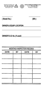 Back of tag has extinguisher data. and Monthly Inspection Records.
